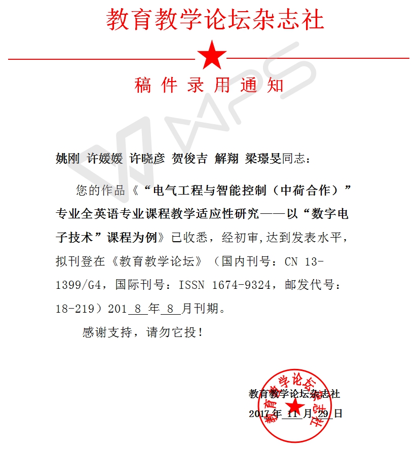 录稿通知_“电气工程与智能控制(中荷合作)”专业全英语专业课程教学适应性研究——以“数字电子技术”课程为例