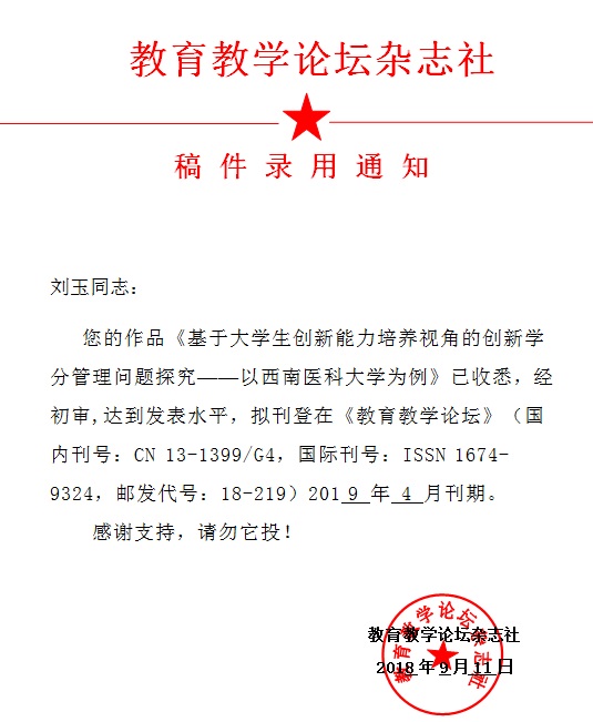 刘玉 --- 《基于大学生创新能力培养视角的创新学分管理问题探究——以西南医科大学为例》录稿通知