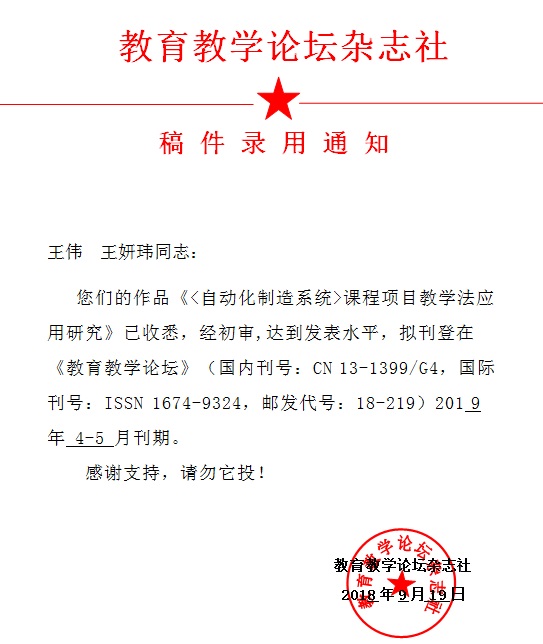 王伟 --- 《<自动化制造系统>课程项目教学法应用研究》录稿通知