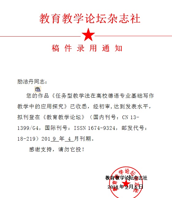 励洁丹 --- 《任务型教学法在高校德语专业基础写作教学中的应用探究》录稿通知