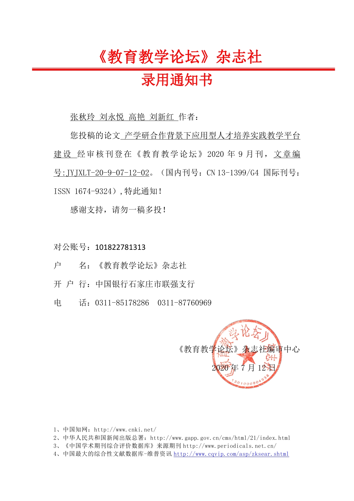 您投稿的论文产学研合作背景下应用型人才培养实践教学平台建设经审核刊登在《教育教学论坛》2020年9月刊,文章编号:JYJXLT-20-9-07-12-02。(国内刊号:CN13-1399/G4 国际刊号:ISSN1674-9324),特此通知!