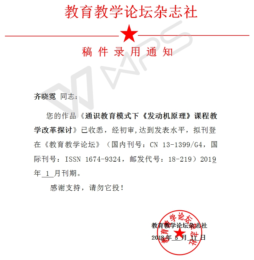 录稿通知 齐晓霓:《通识教育模式下《发动机原理》课程教学改革探讨》
