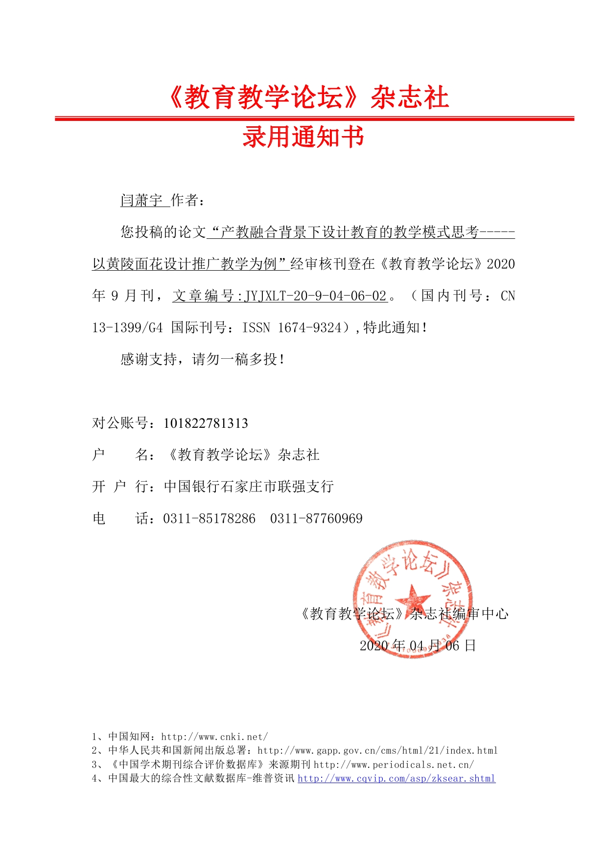 - 上一篇:《教育教学论坛》杂志社 录用通知书——陈美仁,刘杰、郭翔、黄 2022/6/14