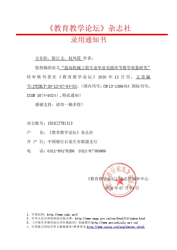 您投稿的论文“提高机械工程专业毕业实践环节教学质量研究”经审核刊登在《教育教学论坛》2020年12月刊,文章编号:JYJXLT-20-12-07-04-02。(国内刊号:CN 13-1399/G4国际刊号:ISSN 1674-9324),特此通知!