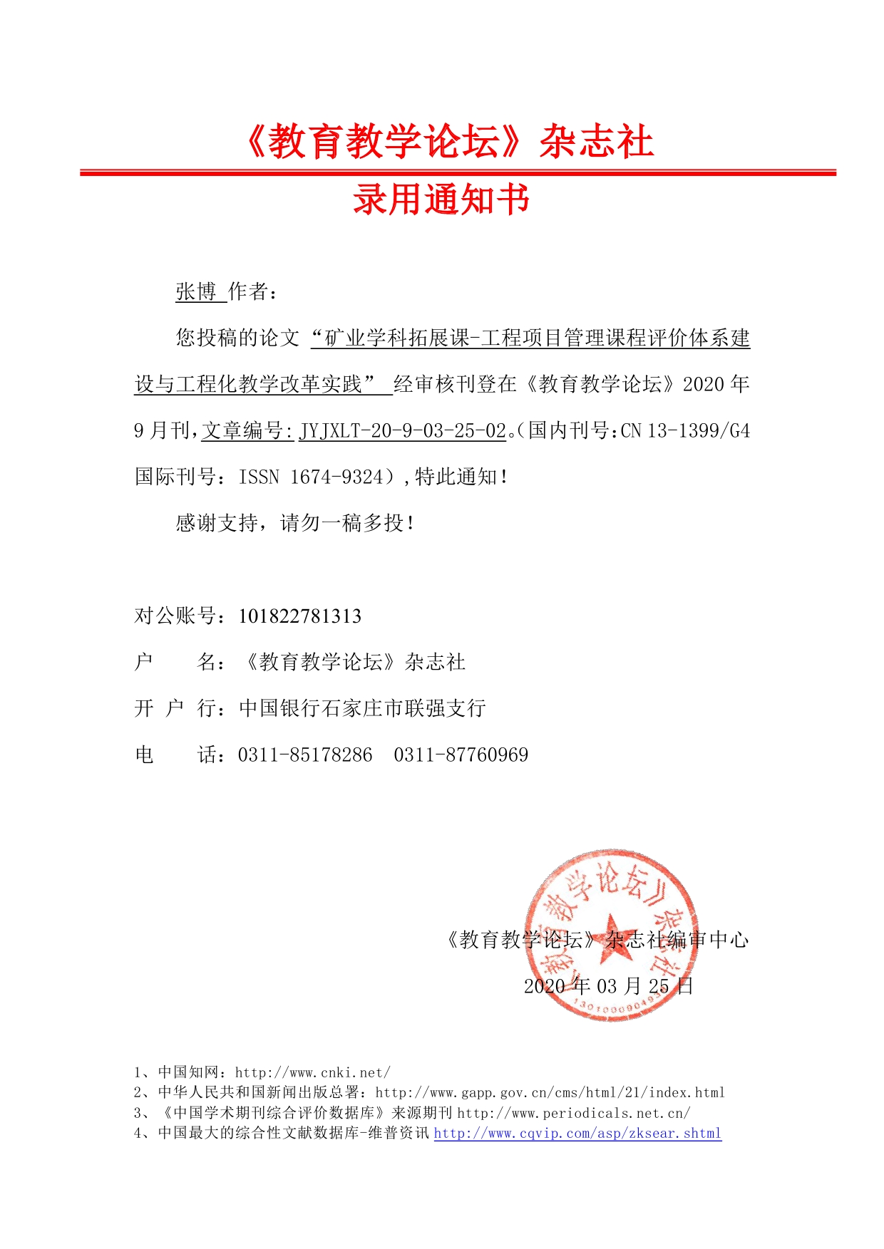 《教育教学论坛》杂志社 录用通知书——张博