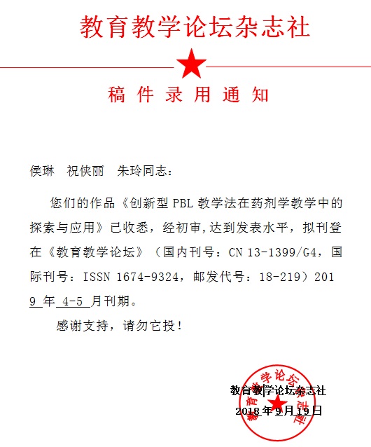 侯琳 --- 《创新型PBL教学法在药剂学教学中的探索与应用》录稿通知