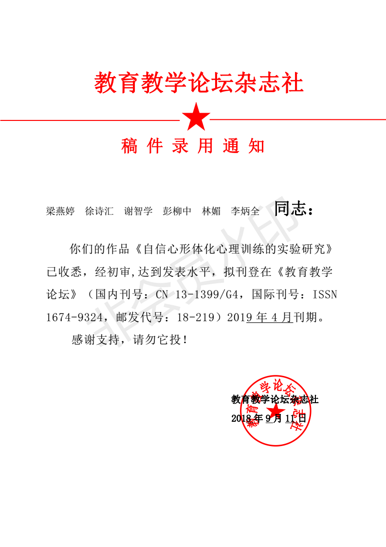 梁燕婷 ----《 自信心形体化心理训练的实验研究》 录用通知