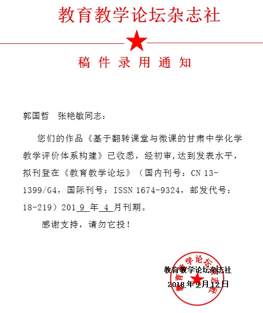 郭国哲 --- 《基于翻转课堂与微课的甘肃中学化学教学评价体系构建》录稿通知