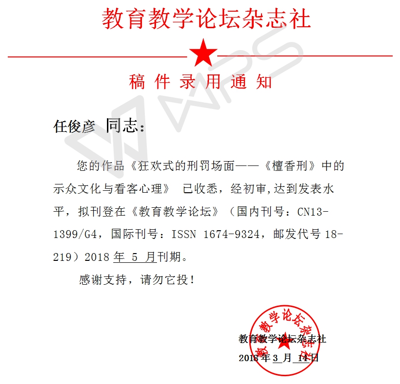 任俊彦 《狂欢式的刑罚场面——《檀香刑》中的示众文化与看客心理》录用通知