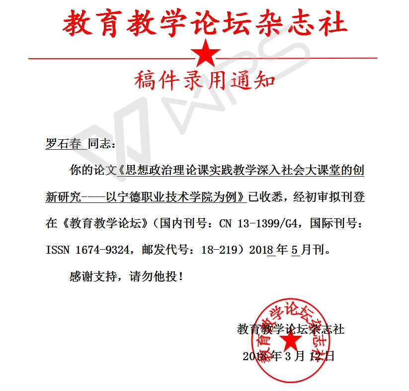 录稿通知 罗石春:《思想政治理论课实践教学深入社会大课堂的创新研究 ----以宁德职业技术学院为例》