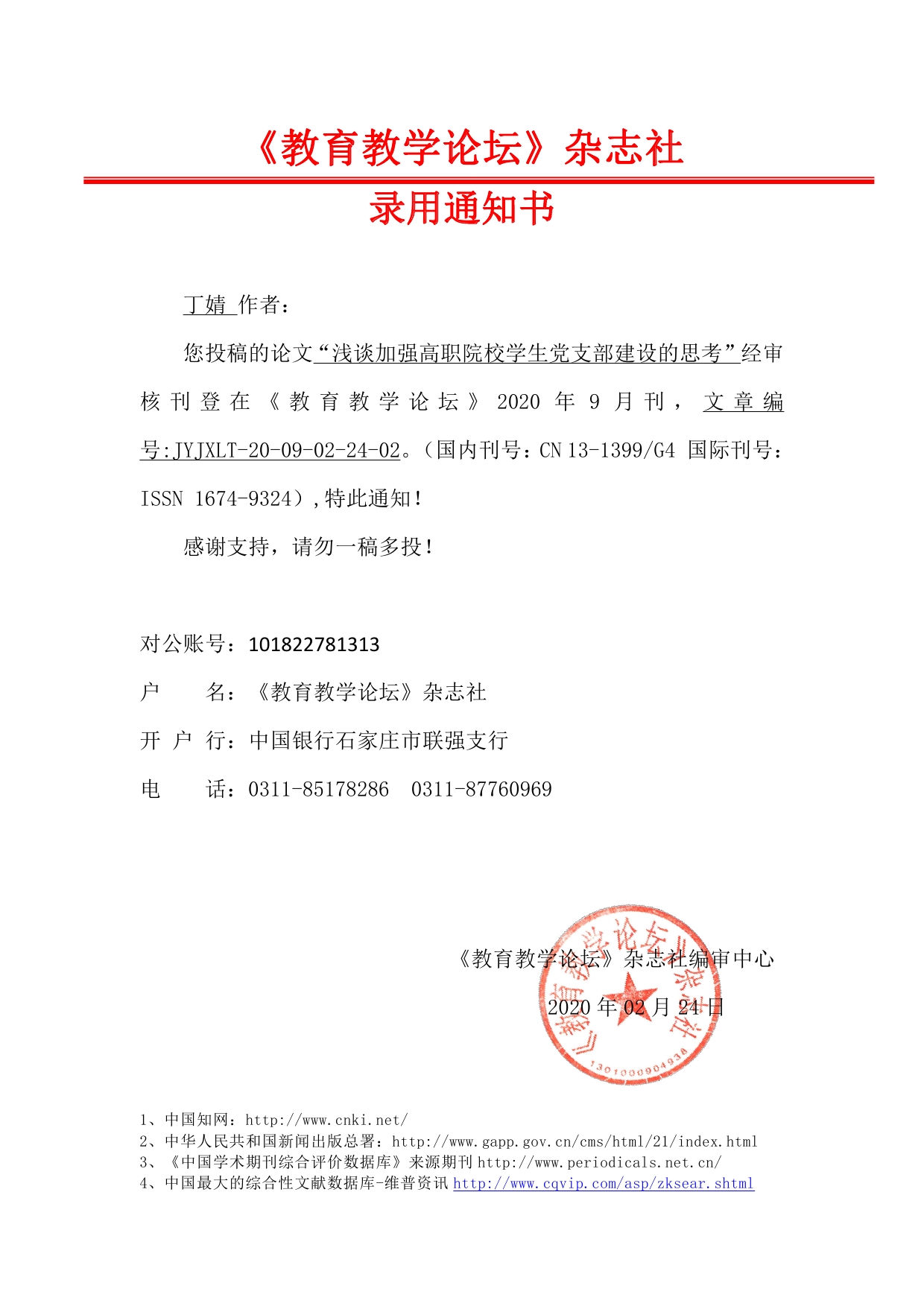 您投稿的论文“浅谈加强高职院校学生党支部建设的思考”经审核刊登在《教育教学论坛》2020年9月刊,文章编号:JYJXLT-20-09-02-24-02。(国内刊号:CN13-1399/G4 国际刊号:ISSN1674-9324),特此通知!
