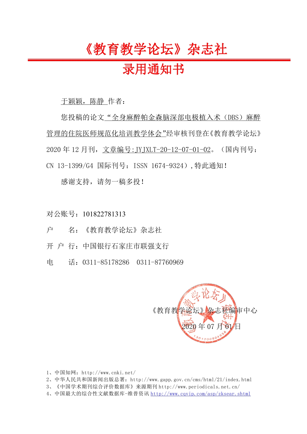 您投稿的论文“全身麻醉帕金森脑深部电极植入术(DBS)麻醉管理的住院医师规范化培训教学体会”经审核刊登在《教育教学论坛》2020年12月刊,文章编号:JYJXLT-20-12-07-01-02。(国内刊号:CN13-1399/G4 国际刊号:ISSN1674-9324),特此通知!